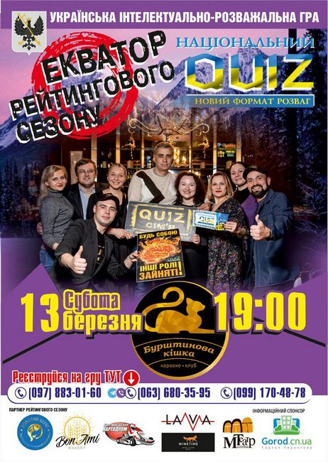 13 березня в Караоке-клуб «Бурштинова кішка» відбудеться 15 рейтингова гра проєкту Національний QUIZ в м.Чернігів! Ще більше цікавих запитань, нові ідеї та натхнення, а також купа подарунків від спонсорів! Все це і не тільки чекає на вас наступної гри!