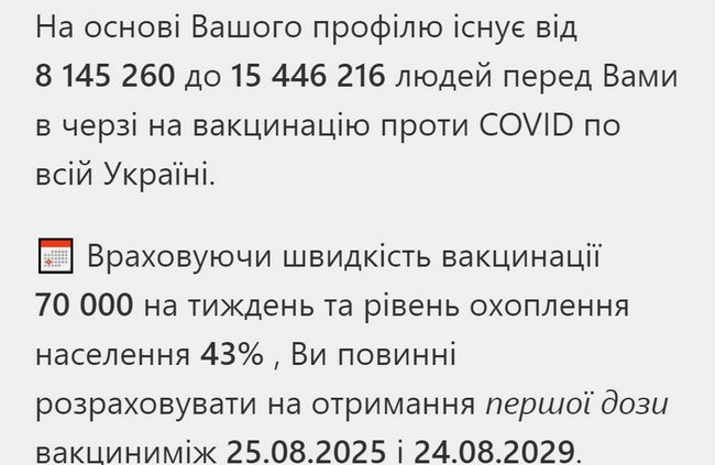 Так, на основі цих показників, 30-річна людина, яка не належить до пріоритетних груп, може отримати першу дозу вакцини між 25.08.2025 і 24.08.2029. І це можливо тільки якщо Міністерство охорони здоров'я вакцинуватися по 10 тисяч людей на добу, як раніше анонсували у відомстві.