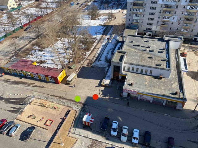 На фото красным кружком отмечено место, где изначально стоял автомобиль, зеленым - то место - после того, как откатился назад