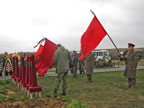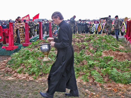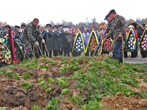 Под залпы военного салюта и звуки военного духового оркестра, останки воинов предаются земле. Представители общественности возлагают цветы на могилы солдат.