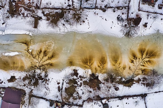На снимках видно, как на ледяной поверхности реки проступают пятна желто- коричневого цвета, образующие причудливые узоры, похожие на ветви деревьев. При этом желтые разводы берут свое начало от берега Стрижня, на котором густо расположены дачные домики и простираются практически на всю его ширину.