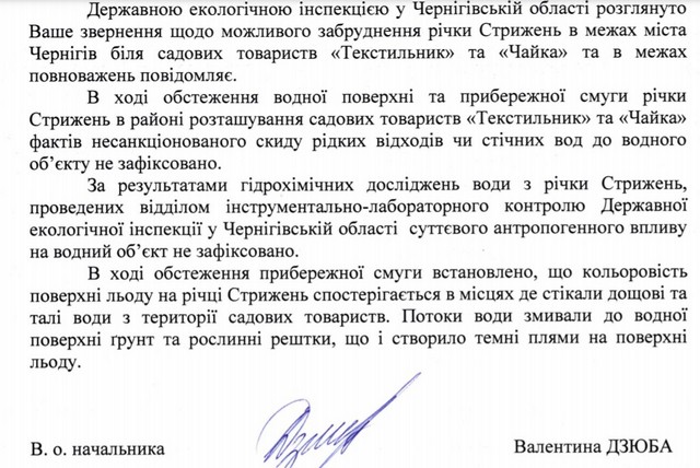 На наш письменный запрос в Государственную экологическую инспекцию Черниговской области по поводу желтых пятен в Стрижне пришел ответ за подписью в.и.о. начальника Валентины Дзюбы: