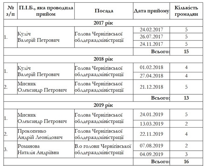 На запит громадської організації “Чернігівська правозахисна спілка” Чернігівська Обласна державна адміністрація надала інформацію щодо здійснення особистого прийому громадян головами адміністрації та виконуючими їх обов’язки з січня 2017 року по березень 2021.