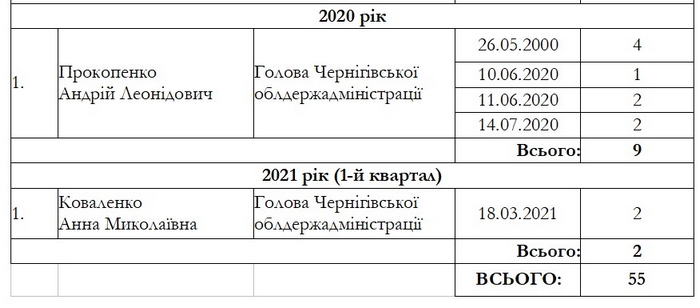 Тобто за останні 4 роки голови Чернігівської обласної адміністрації (їх за цей час на посадах було 4 - Куліч, Мисник, Прокопенко, Коваленко, та 5-та в.о. обов’язки голови ОДА - Наталія Романова) прийняли 55 громадян. При цьому нинішня голова ОДА Анна Коваленко зустрілася особисто з двома громадянами за період з 13 жовтня 2020-го по квітень 2021-го.