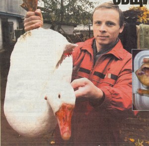 Гусей загнали під ворота. Ґелґочуть. І ну тікати в різні боки. А я на біленьку сачок накинув і до землі притис. Василівна її за ноги ухопила й із сачка вийняла. Поки ходила за ножем, дала потримати. На моє здивування, гуска покірно висіла, крильми битися й не думала. Гусак не захищав.