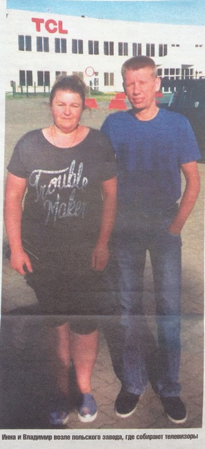С работой в Польше помог племянник Женя. Он там уже много лет. Инна с Вовой открыли визу на полгода. Сначала комплектовали парфюмерию. По восемь злотых платили за час (один злотый — 7,38 гривны). Маловато. После окончания визы вернулись домой и через черниговское агентство нашли другую работу. Почти год как собирают плазмы на заводе «TCL» в городе Тарчин, от Варшавы — 50 километров. Инна стоит на линии, подсоединяет детальки. А Володю повысили: прибором контролирует исправность техники на линии. Получают 13 с половиной злотых в час. Трудятся по 8-12 часов в сутки. Когда есть заказы, выходят и в ночные смены. Но говорят, работа не тяжелая, справляются. В этом месяце, дочь говорила, 25 тысяч гривен заработала. А они вдвоем. Меньше тысячи долларов в месяц не откладывают.