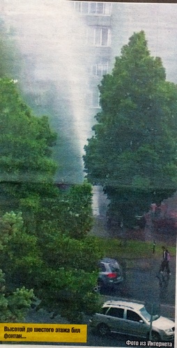 14 мая около девяти утра на автомобильной стоянке возле магазина «Будматеріали» (через дорогу областное управление полиции) по проспекту Победы в Чернигове бил фонтан. Из-под асфальта. Высотой — до шестого этажа, почти 20 метров. «Еще один открыли», — шутили черниговцы. Зеваки снимали на телефоны и выкладывали в соцсети.