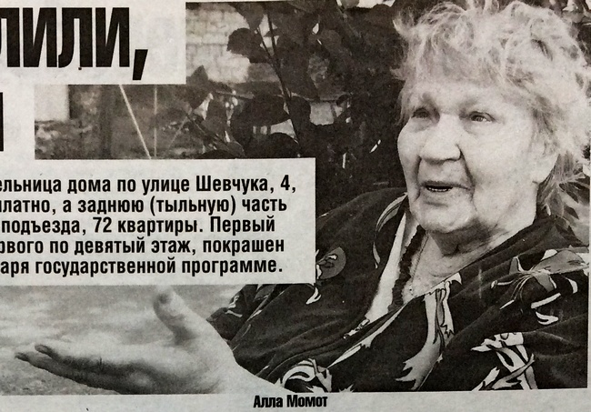 79-летняя черниговка Алла Момот, жительница дома по улице Шевчука, 4, возмущается: фасад дома утеплили бесплатно, а заднюю (тыльную) часть оставили ни с чем. Девятиэтажка на два подъезда, 72 квартиры. Первый подъезд с лицевой стороны утеплен с первого по девятый этаж, покрашен в персиковый цвет. Утепляли дом благодаря государственной программе.