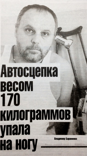 26 мая в три часа на ночной смене Владимиру Бараненко на ногу упала автосцепка. Автоматическое сцепное устройство между вагонами весом порядка 170 килограммов.