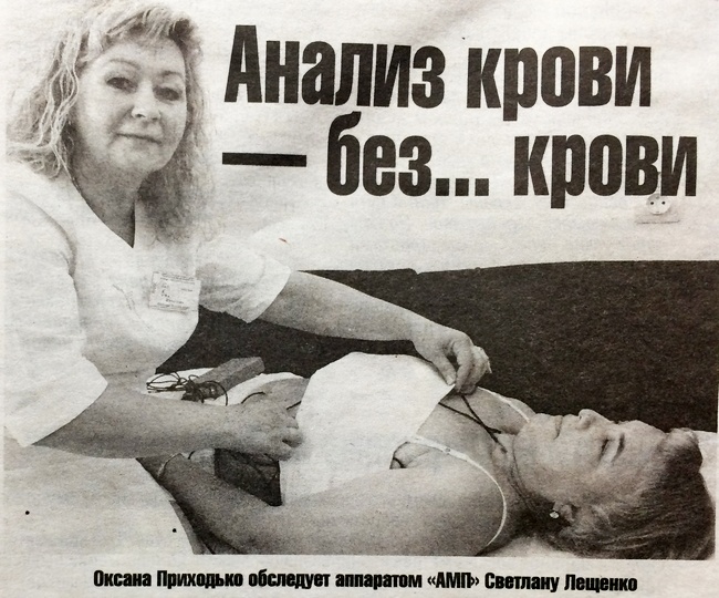 В области это третий бесконтактный анализатор крови. Есть в поселке Десна Козелецкого района. Есть в Бобровице. «АМП», то есть анализатор Малыхина-Пулавского, разработан в Харьковском НИИ. С Козелеччины и из Десны родом два из четырех конструкторов. Анализатор есть за границей. Стоимость 20 тысяч долларов. Почти 522 тысячи гривен. Больницам Черниговщины, в том числе третьей черниговской, подарен.