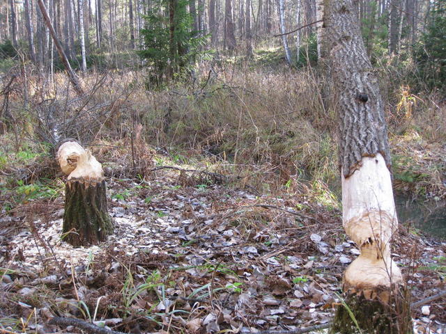 Поваленные деревья, обглоданные пни конусовидной формы и кучи свежих опилок — все это можно увидеть возле водоема вблизи Песок Черниговского района. Это типичные последствия деятельности бобров, которых здесь развелось много.