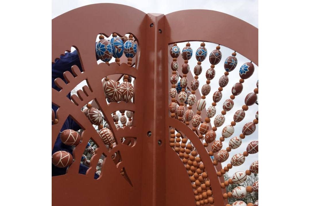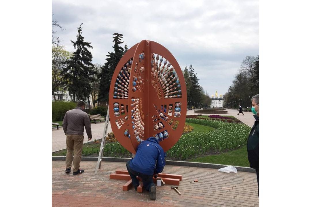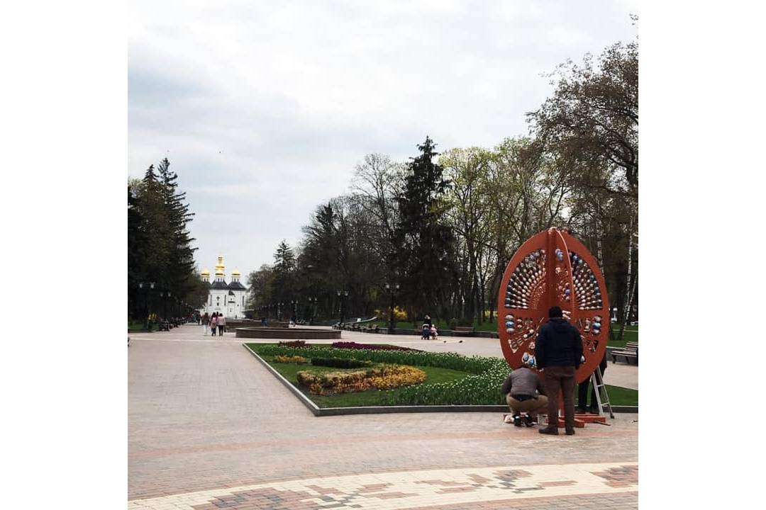 У Чернігові сьогодні, 29 квітня, на Алеї Героїв встановили тематичну композицію-фотозону у вигляді одного з символів Великодня – писанки. Висота дерев’яної композиції майже 3 метри. На ній розміщені 276 маленьких крашанок, які протягом трьох місяців розписували народні майстри Чернігівщини. Для розпису використовували акрилові фарби різних кольорів.
