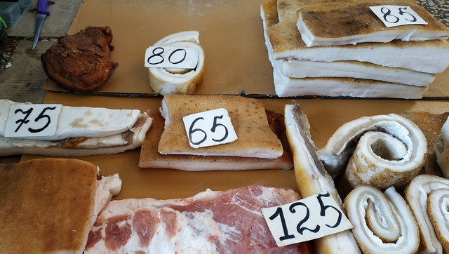 Андрей, 25 лет, «молодая смена» своей мамы, рассказал, что с утра ошеек продавали по 250 гривен за килограмм, подчеревок – по 150, а вот сало прямо сейчас отдают чуть ли не даром – по 20 гривен за кило.