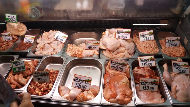Начинаем с мясного павильона. Напротив входа в него жительницы из сел продают свежую домашнюю птицу. Антонина и Наталья приехали из Менского района. Курочки и петушки предлагают по 75-80 грн. за кг, уточки – по 120, мясо кролика по 180, нутрии –150 грн. за кг, куриные бульонные наборы - по 20 грн.