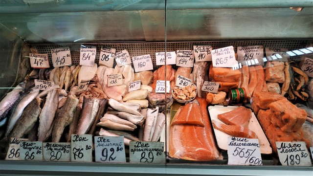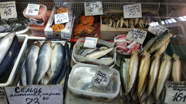 В рыбном павильоне горожане могут выбрать по своему вкусу свежемороженую, охлажденную, соленую и копченую рыбу. Также, в продаже есть весовая лососевая икра, кальмары и креветки.
