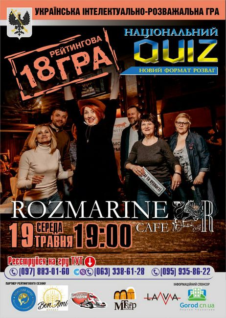 19 травня в середу в закладі "ROZMARINE" відбудеться 18 рейтингова гра проєкту Національний QUIZ в м.Чернігів! Ще більше цікавих запитань, нові ідеї та натхнення, а також купа подарунків від спонсорів! Все це і не тільки чекає на вас наступної гри!