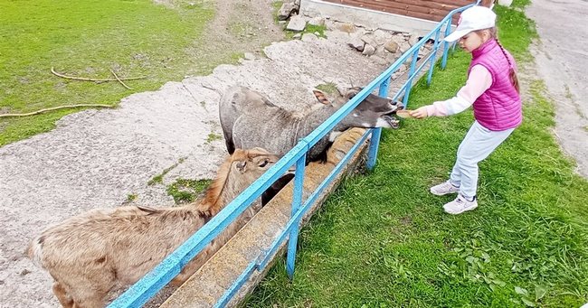 Пан Антон з Чернігова зі своєю п’ятирічною донькою Веронікою вже не вперше гостюють у менських тваринок. Ось і цього разу приїхали не з порожніми руками, а з цілим пакетом смаколиків. Веронічка хоч і з острахом, але з великим задоволенням годувала білим хлібом копитних. Їй особливо подобаються кози та вівці. А мавпочок, окрім хлібця, вона почастувала яблуками. Тільки пеліканів не вдалося нічим пригостити: їм хліба не можна, вони полюбляють рибу.