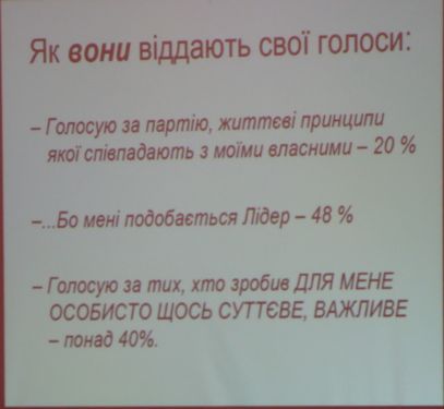 „Вибори дуже часто нагадують звичайні рекламні кампанії. На «розкрутку» кандидатів викидаються величезні гроші, які потім часто просто летять за вітром. На останніх виборах одна з партій виготовила 45 мільйонів прапорців з власною символікою. І ви думаєте, її це додало голосів?, - запитав Андрій Куліш.
