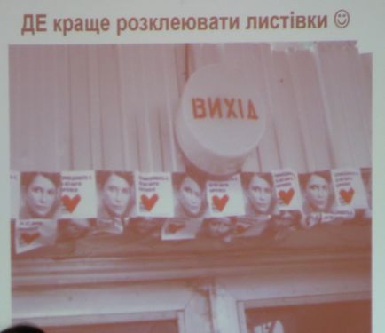 Наприклад, наклейки з Юлією Володимирівною агітатори розмістили над дверима лікарні, поряд із надписом „Вихід”. З одного боку складається враження, ніби з Юлією Володимирівною „є вихід”, але з іншого, коли прибиральниці починають це все знімати, скільки гарних слів вони говорять на її адресу...?