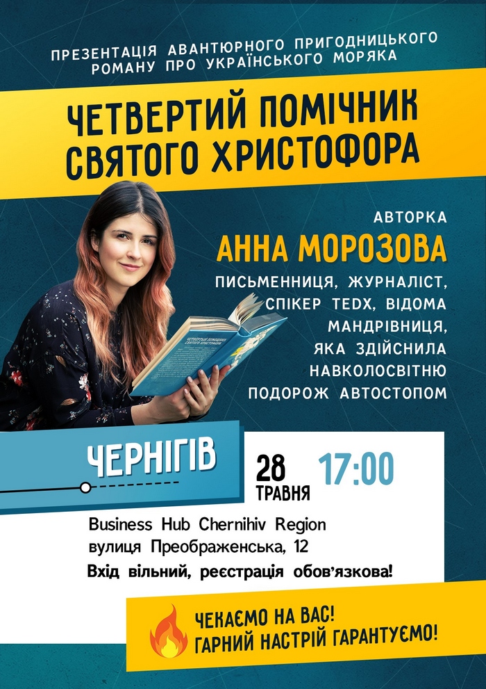 28 травня, о 17.00 у Чернігові у Business Hub, що по вул. Преображенська, 12 пройде зустріч з відомою українською мандрівницею Анною Морозовою, яка відвідала 70 країн та здійснила навколосвітню подорож автостопом.