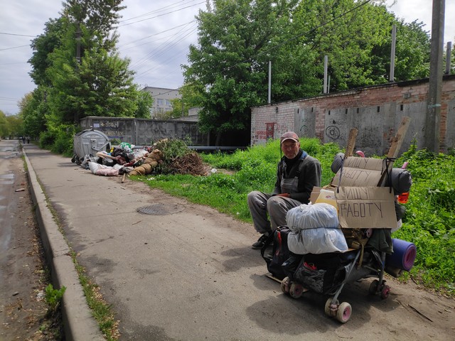 Сегодня, 24 мая возле мусорных баков по ул. Маресьева (в районе государственной ветлечебницы) на деревянной табуретке, около 13.30 дня дремал наклонив голову мужчина средних лет. Одет в три тёплых свитера, поверху джинсовый ветхий комбинезон, на руках - строительные перчатки, на головке кепка бренда Reebok. Обут в черные кеды с тремя белыми полосками. Возле него стоит сумка и детская коляска, в которой упакован весь его нехитрый скарб: каремат, одежда, постельное и прочее. На коляске закреплены 2 картонки, на которых четким аккуратным почерком написано: "Ищу работу".