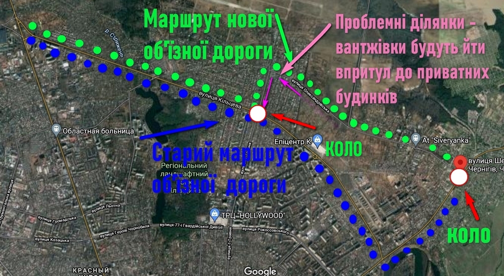 Будівництво нової об'їзної дороги у Чернігові - на часі. Але чи варто її просто переносити з одного району до іншого, який у повідомленнях називається "малозаселеним"? Район активно розбудовується і люди тут є! Тим більше, що пропускна спроможність нової дороги буде меншою, ніж у існуючої, через вузьку ділянку дороги в районі перехрестя вулиць Олександрівської та 1 Травня.