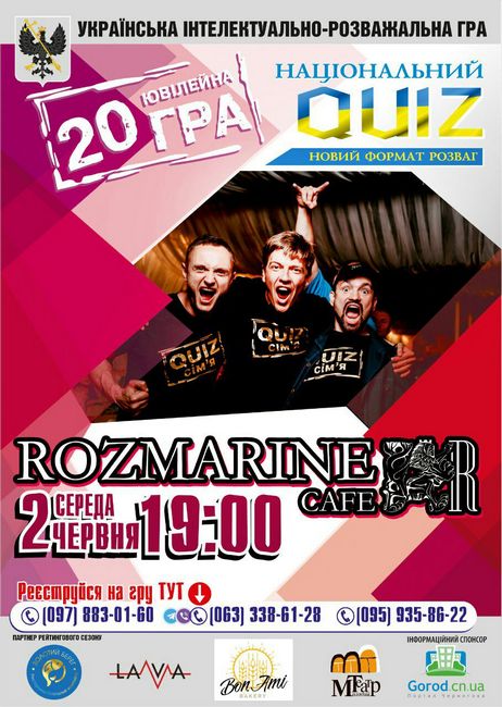 2 червня в середу в закладі "ROZMARINE" відбудеться 20 рейтингова гра проєкту Національний QUIZ в м.Чернігів! Ще більше цікавих запитань, нові ідеї та натхнення, а також купа подарунків від спонсорів! Все це і не тільки чекає на вас наступної гри!