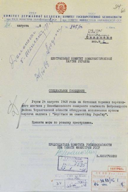 «Утром 24 августа 1968 года на бетонных перилах переходного мостика Новобыковського сахарного комбината Бобровицкого района Черниговской области обнаружена исполнена куском кирпича напись: