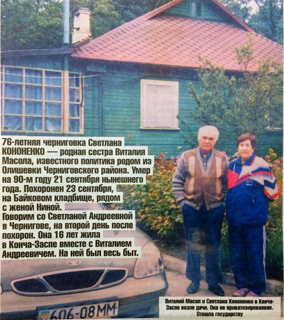 76-летняя черниговка Светлана Кононенко — родная сестра Виталия Масола, известного политика родом из Олишевки Черниговского района. Умер на 90-м году 21 сентября нынешнего года. Похоронен 23 сентября, на Байковом кладбище, рядом с женой Ниной. Говорим со Светланой Андреевной в Чернигове, на второй день после похорон. Она 16 лет жила в Конча-Заспе вместе с Виталием Андреевичем. На ней был весь быт.