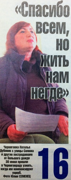 6 ноября 47-летняя Наталья Дубовик, пострадавшая от большого черниговского дождя 30 июня, жительница улицы Селюка, пришла в Черниговраду с распоряжением Кабмина от 31 октября. Там сказано: «Уряд виділив кошти на ліквідацію наслідків надзвичайної ситуації, що склалася у м. Чернігові влітку. Зокрема, Чернігівській обласній державній адміністрації з резервного фонду державного бюджету буде виділено 16 млн грн для проведення аварійно-відновних робіт.