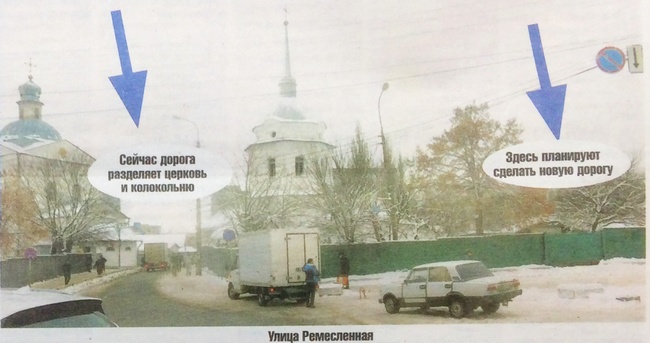 В планах — проложить новый асфальт в объезд, за колокольней. Расширить дорогу, сделать двухстороннее движение. Сейчас «церковная» территория ограждена серым и зеленым деревянным забором. По соседству — жилой дом барачного типа. По Ремесленной ходит автобус №35. Жильцам придется съехать, маршрутку отменить? Или дорога будет, как на Шерстянку, только на бумаге?
