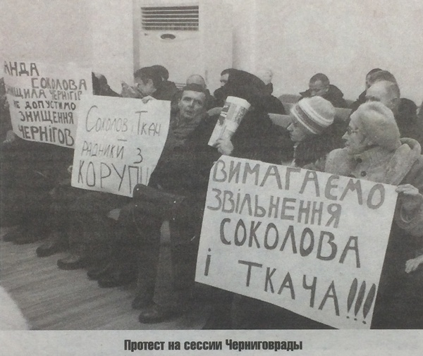 20 декабря черниговские социалисты пришли на сессию Черниговрады, потом на сессию облрады. Привели с собой активистов, принесли плакаты. И 4,5 тысячи подписей, собранных на улицах Чернигова всего за пять дней. Так продолжился протест против назначений бывшего мэра Чернигова 57-летнего Александра Соколова и бывшего главы Черниговоблэнерго 46- летнего Владимира Ткача на должности советников главы облгосадминистрации 47- летнего Александра Мысника.