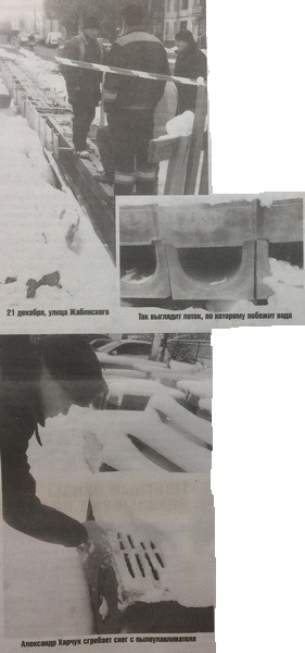 На дне траншеи сделали основание из бетона марки «200». Лотки — сборный железобетон. Устанавливаем на бетонную подушку с учетом уклона. Каждый ниже предыдущего на 0,5 сантиметра. Сверху—железобетонная решетка. Каждый стык замазывается специальной мастикой, чтобы вода не просачивалась. Вон они хранятся в нашем дворе, — показывает из окна своего кабинета на конструкции, присыпанные снегом. — После установки по бокам, сантиметров по 20, будем заливать бетон с каждой стороны. Закатывать асфальтом. Вода будет сходить в лоток. Дальше стекать в ливнеприемники, которые ведут к канализационному колодцу. Пылеулавливатели с «крышками». «Крышки» можно снимать, чтобы чистить песок, мусор, который попал в лоток.