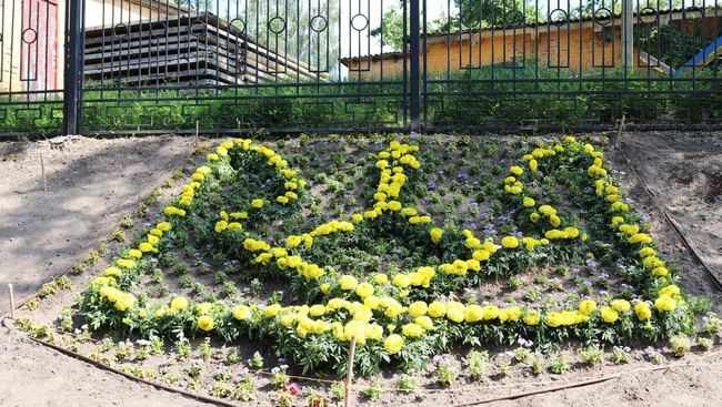 На новостворену клумбу було висаджено майже дві тисячі саджанців квіткових однорічних і багаторічних різнокольорових рослин: мікси бегонії, колеуси, крупноголові чорнобривці, гейхери та агератуми. З чорнобривців та агератумів виклали український символ – тризуб.