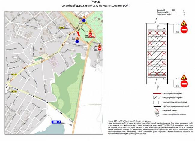 Схему організації дорожнього руху на час виконання зазначених робіт та схему об’їзду погоджено з управлінням патрульної поліції у м. Чернігові.