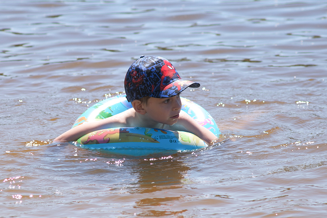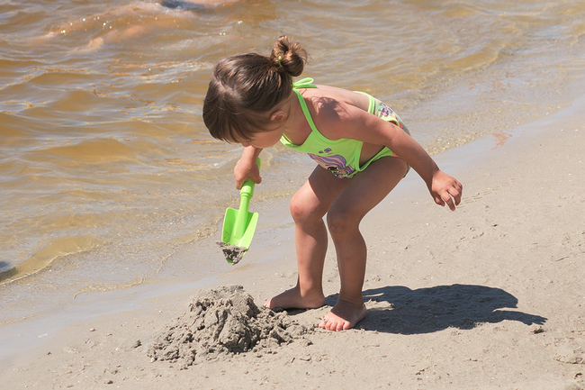 Ясная летняя погода благоволит жителям города, и они массово отправились на пляж «Золотой Берег». Здесь для комфортного отдыха есть все. Спортивные и детские площадки, кафе, аттракционы, медпункт. Песок на пляже раскален и отдыхающие стремятся расположиться поближе к воде. На пляже работают спасатели, отдельно огорожено место для купания детей.