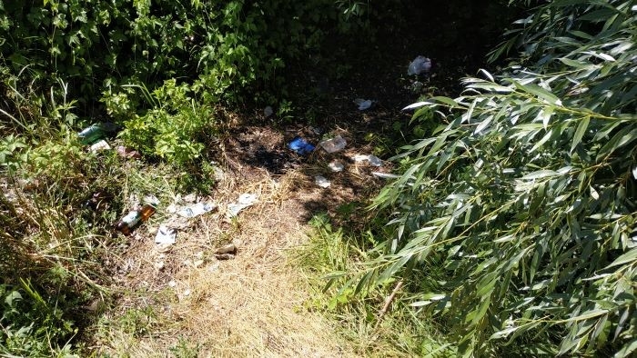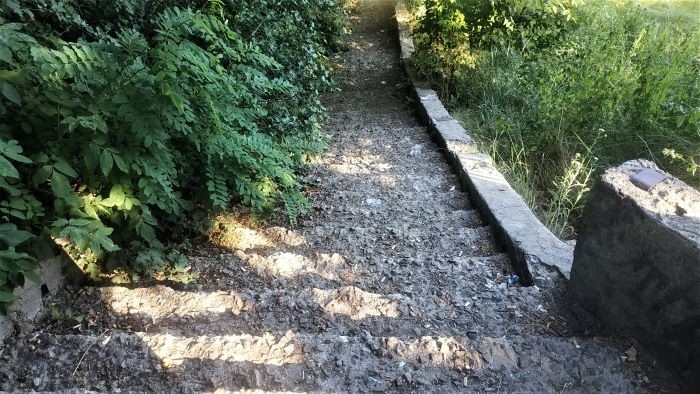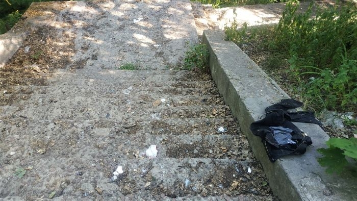 Ну а мы, как и прежде, спускались пешком по старой каменной лестнице, ведущей от школы №24, чтобы исследовать сначала зеленую территорию у озера. Есть еще стихийно образовавшиеся спуски от школы и Троицкой церкви, но весьма неудобные, и даже, в какой-то мере, опасные. Здесь и начинается «мусорная» история. Мусор просто повсюду: на лестнице, среди зелени в кустах, вдоль дороги и встречается на всем пути.