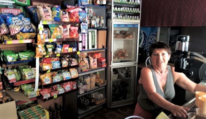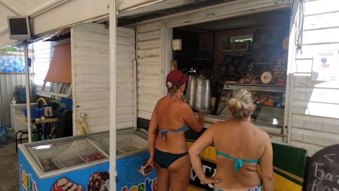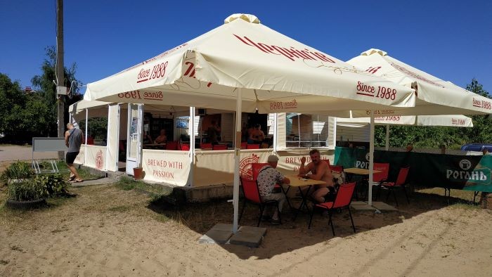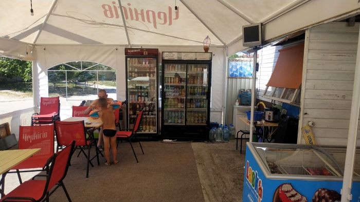 В конце пляжа находится большая палатка и зонт. Бойкая продавец по имени Татьяна наливает квас и пиво желающим (25 грн./0,5 л). В продаже есть чипсы, сухарики, леденцы, кукурузные палочки, разные снеки, сигареты. Перекусить можно сосиской в тесте, пиццей или пирожками. Для удобства в палатке и под зонтом установлено несколько столиков и стульев. Есть холодильники для прохладительных напитков и морозильный ларь с мороженым (цены от 20 до 60 грн.).