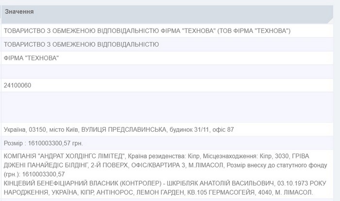 ТОВАРИСТВО З ОБМЕЖЕНОЮ ВІДПОВІДАЛЬНІСТЮ ФІРМА "ТЕХНОВА" (ТОВ ФІРМА "ТЕХНОВА") було зареєстровано 21.11.1996 на території Київської області. Кінцевий бенефіціарний власник (контролер) - 47-річний Шкрібляк Анатолій Васильович. Шкрібляк має відношення до ТЕЦ у м.Чернігів, Суми та Черкаси. За версією Форбс Україна Шкрібляк займає 99-місце серед 100 найбагатших людей нашої країни Володіє мережею ТРЦ у м.Харків, Львів та Черкаси. Нещодавно СБУ оголосила про початок досудового розслідування за фактами поставки на приналежну Шкрібляку Чернігівську ТЕЦ вугілля з окупованих територій.