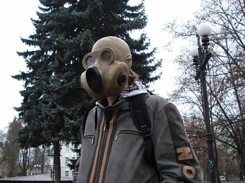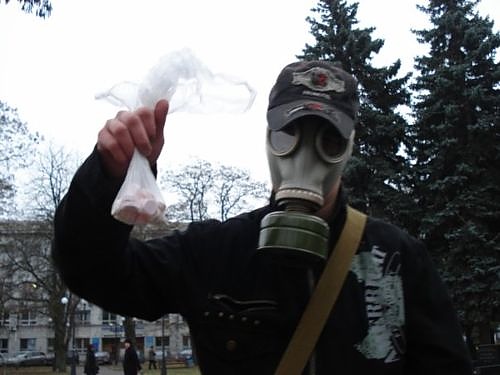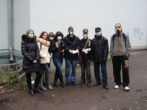 В Чернигове состоялся флешмоб посвященный панике, которую в Украину принес грипп. Суть действа заключалась в борьбе с плохим настроением.На моб приходили в противогазах и повязках.Принесли 6 пачек аскорбинки. Флешмоб начался в 13:30 возле музыкального фонтана. Участники предлагали прохожим лекарство от гриппа A/H1N1 (это были те 6 пачек аскорбинки разложение в 3 кулечка).