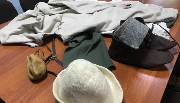 Він розповів, що в комплекті – лляна спідня сорочка, вовняна свита, штани-гачі, вовняні онучі, шкіряні черевики та ремінь із пряжкою, на якому – ніж із гаманцем, валяна з повсті шапка та наплічна торбинка. Всі ці речі своїми руками виготовили Олег Ярошенко та його дружина Ольга.