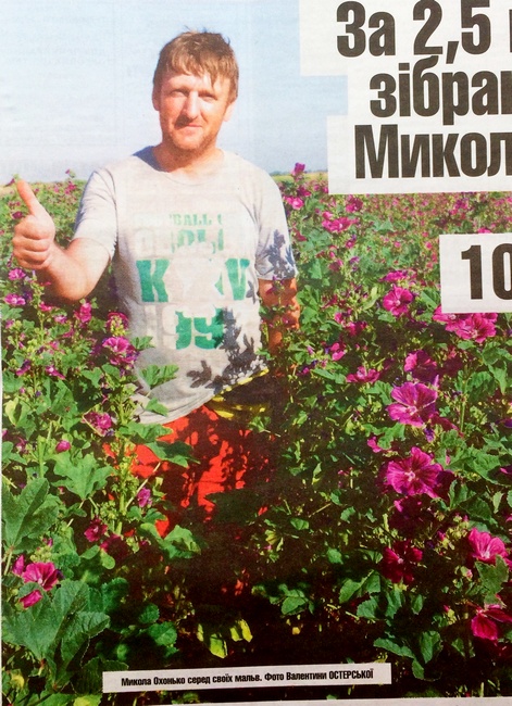 Дорогу до двору 40-річного Миколи Охонькоа в селищі Макошине, що на Меншині, покажуть усі. Віднедавна чоловік зажив слави роботодавця, який платить живі гроші. За 2,5 кілограма зібраних квітів мальви дає 100 гривень. Якщо набереш від шести до восьми кілограмів — по 45 гривень за кіло. Більше восьми — по п’ятдесят. Робочий день: з 8.30 до 12.30 і з 16.00 до 20.30.