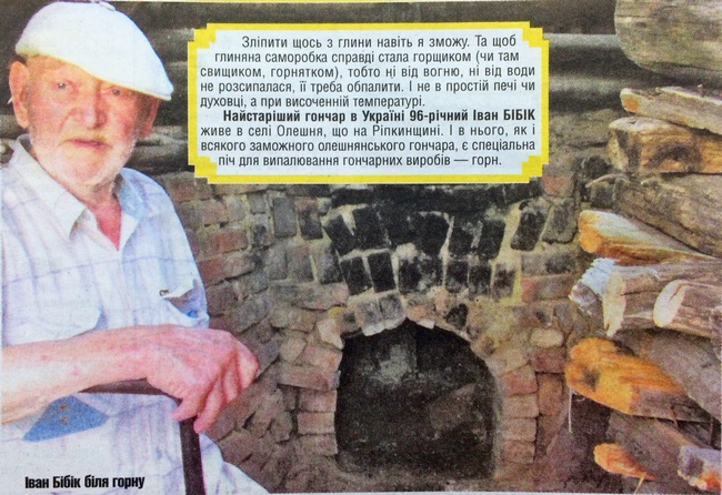 Найстаріший гончар в Україні 96-річний Іван Бібік живе в селі Олешня, що на Ріпкинщині. І в нього, як і всякого заможного олешнянського гончара, є спеціальна піч для випалювання гончарних виробів — горн.