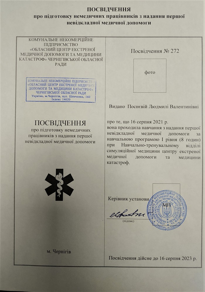 Кожен учасник курсу навчання відмінно впорався з наданням невідкладної першої допомоги людині, навчився та закріпив на практиці знання з проведення серцево-легеневої реанімації, і отримав спеціальне посвідчення від КНП «Обласний центр екстреної медичної допомоги та медицини катастроф» Чернігівської обласної ради.