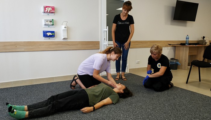 Після проведення тренерами серцево-легеневої реанімації, учасники навчання спробували на манекенах зробити самостійно всі необхідні дії під наглядом Людмили та Ірини.