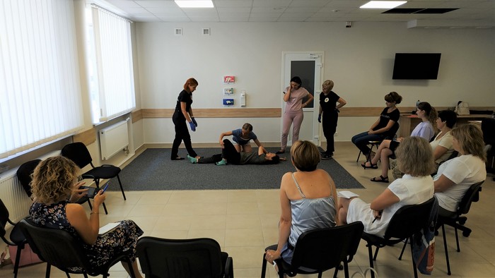 - На сьогоднішньому занятті медичні працівники повторять свої знання, а вчителі навчаться розрізняти жива людина чи ні, як правильно поводитися з людиною без свідомості, як надавати допомогу при клінічній смерті. Кожна учасниця навчання відпрацює навички серцево-легеневої реанімації, зупинки кровотечі та у кінці навчання після іспиту у разі успішної здачі іспиту, отримає посвідчення.