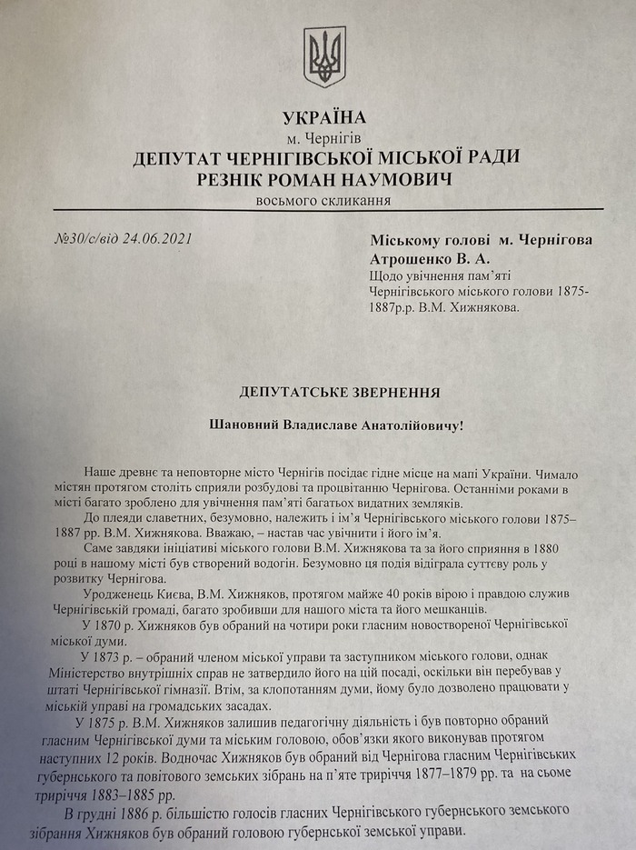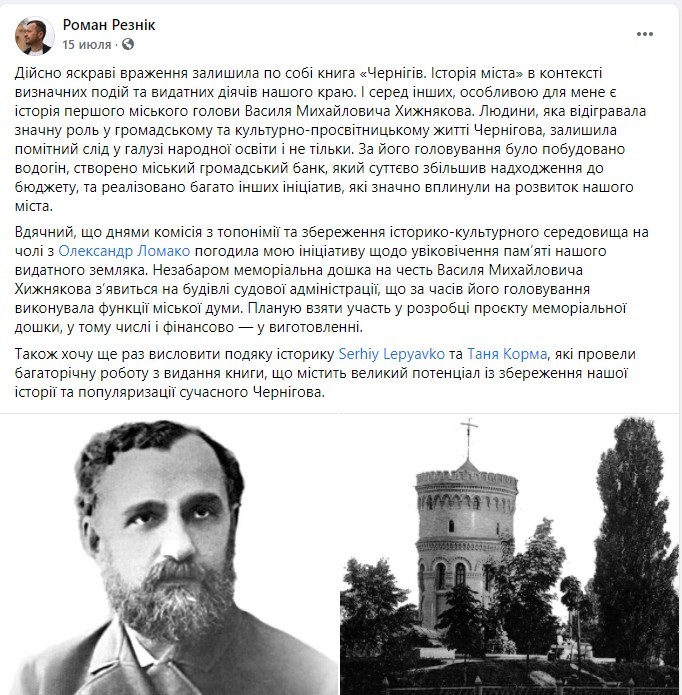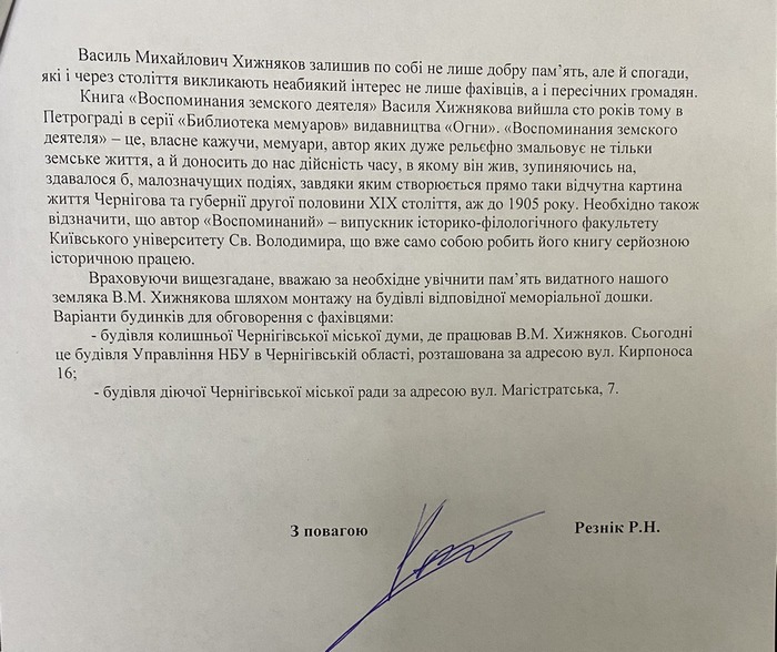 12 серпня під час проведення чергового виконкому стало відомо, що до мерії надійшло звернення від депутата міськради 43-річного Резніка Романа з пропозицією увіковічити пам’ять колишнього міського голови Чернігова Хижнякова Василя Михайловича (був мером з 1886 по 1896 р.р.). На думку депутата - це видатна постать 19-го сторіччя, яка дуже багато зробила для нашого міста. Було озвучено, що до Дня міста мармурове погруддя, вартістю 700 тисяч гривень встановлять на будівлю, яку зараз займає Територіальне управління Державної судової адміністрації України у Чернiгiвській областi (вулиця Кирпоноса, 16), в якому з часів мерства Хижнякова було розташовано Чернігівську губернську земську управу.