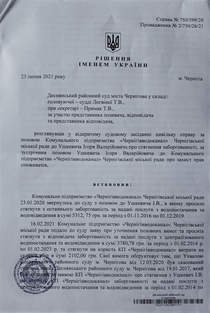 23 липня 2021 року Деснянський районний суд розглянув позов КП «Чернігіввводоканал» до Ушкевича Ігоря Валерійовича про стягнення заборгованості за його зустрічним позовом до КП «Чернігіввводоканал» про захист справ споживачів.