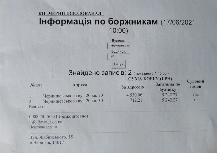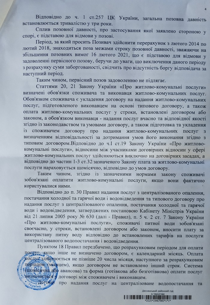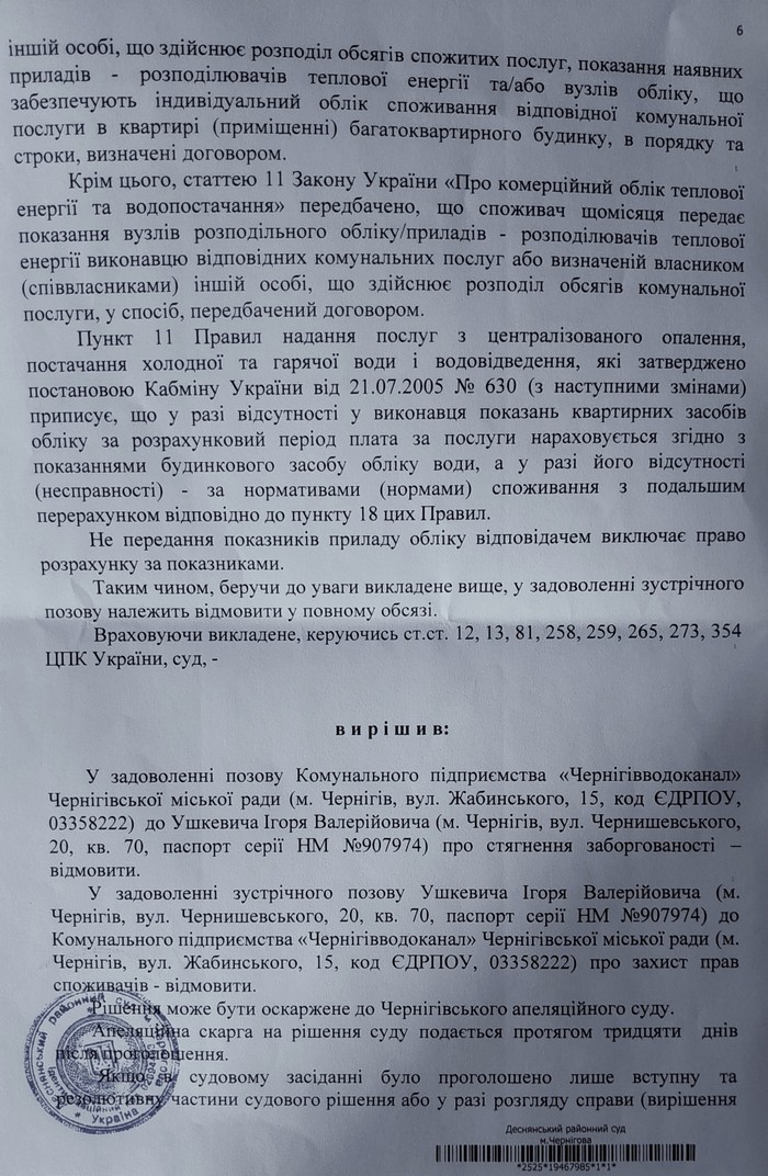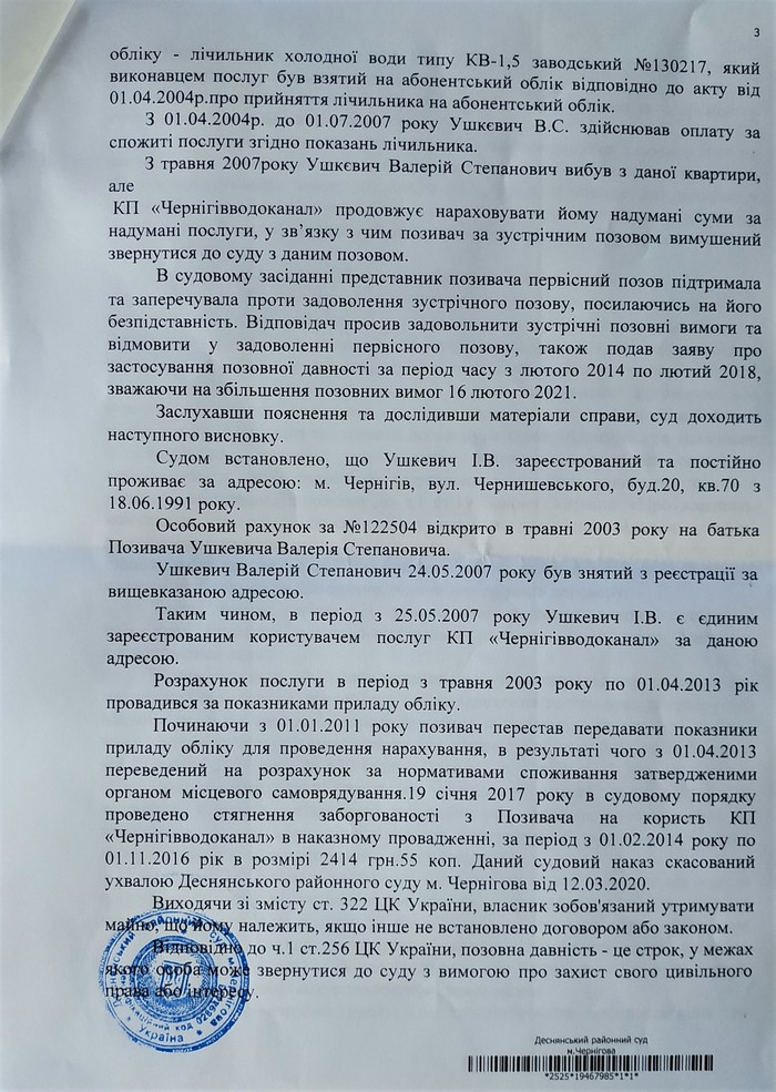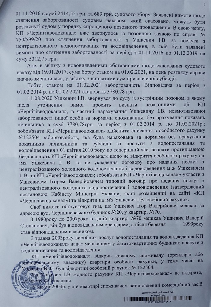До редакції Gorod.cn.ua звернувся 45-річний житель Чернігова Ушкевич Ігор Валерійович, який мешкає за адресою: вул. Чернишевського буд. 20, кв.70 з проханням оприлюднити рішення Деснянського районного суду у складі головуючої судді Логвінової Т.В., який відбувся 23 липня 2021 року. Ушкевич І.В. вважає, що КП «Чернігіввводоканал» безпідставно намагається стягнути з нього борг.