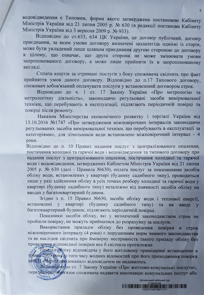 КП «Чернігівводоканал», який є виконавцем послуг з водопостачання та водовідведення, як монопольний суб’єкт господарювання, що здійснюють обслуговування відповідних засобів вимірювальної техніки, з квітня 2010 р. тривалий час ухилявся від здійснення своїх обов’язків щодо повірки мого лічильника води КВ-1,5 №130217. При цьому з мотивів закінчення строків повірки, на свій розсуд зняв лічильник з обліку, чим порушив вимоги п.13.3 Правил користування системами комунального водопостачання та водовідведення в містах і селищах України, та з 1 квітня 2013 року по теперішній час безпідставно почав нараховувати оплату згідно норм водопостачання без урахування показань квартирного та будинкового лічильника.